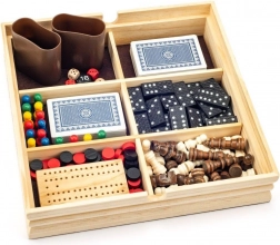 - Fa játéktáblák/doboz, sakkfigurák, kövek a malomhoz és a backgammonhoz, bábuk és dobókockák a Ki nevet a végén játékhoz