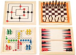 Ez az univerzális, 4 az 1-ben fa készlet klasszikus stratégiai és családi játékokat kínál egy elegáns csomagban. A masszív természetes fa és a precízen készített elemek hosszú órákon át tartó játékélményt biztosítanak, miközben fejlesztik a logikus gondolkodást, a koncentrációt és a fair play szemléletét.