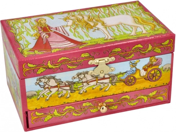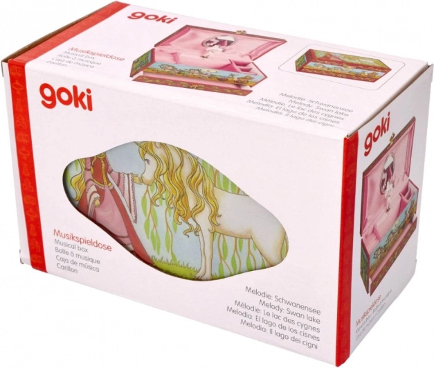 A zenedoboz stílusú ékszerdoboz ideális kiegészítő a kis hölgyek számára, akik elegánsan szeretnék tárolni ékszereiket. Kinyitáskor a Hattyúk tava operából származó dallam csendül fel, és a fehér lovacska táncra perdül a tükör előtt.