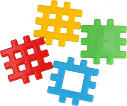 Kb. 10,5 × 10,5 cm-es elemek rácszáras zárral, amelyek kényelmesen foghatók és biztonságosan illeszkednek – tökéletesek 2 éves kortól kis kezeknek.