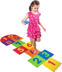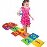 A számozott elemekre ugrálás és a karikadobás fejleszti az egyensúlyt, koordinációt, ügyességet és a számfogalmat.