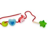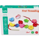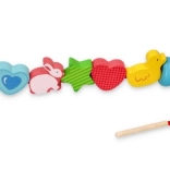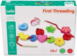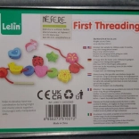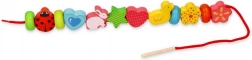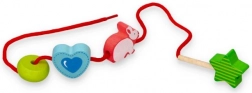 A készlet különböző formájú és színű fa gyöngyöket tartalmaz, amelyeket a gyerekek egy textil zsinórra fűzhetnek fa végekkel. Ez erősíti a gyerekek kreativitását és képzelőerejét.