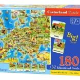 A Castorland Európa térképe oktató puzzle ötvözi a szórakozást és a tanulást. A gyerekek egy nagy kontinens-térképet raknak ki, miközben a kvízdarabok segítségével felfedezik az egyes országok fővárosait, nevezetességeit és jellegzetes szimbólumait. A térképen megtalálható például a Károly-híd Csehországban, a Colosseum Olaszországban, az Eiffel-torony Franciaországban, a Brandenburger kapu Németországban, a Sagrada Família Spanyolországban vagy az Akropolisz Görögországban.