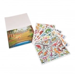 A készlet 185 színes matricát tartalmaz, melyek dinoszauruszokat és őskori állatokat ábrázolnak.