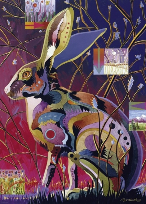 Ez a különleges puzzle Bob Coonts, a Sziklás-hegységben élő művész markáns, dekoratív kompozícióját mutatja be, aki az állatok szépségét megragadó, színgazdag stílusáról ismert. A nyúl motívum a természet szerelmeseinek és az egyedi illusztrációk gyűjtőinek egyaránt örömet okoz.