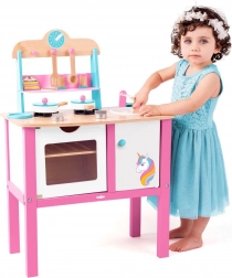 WOODY gyerek fa konyhácska unikornissal – 17 db tartozék, 50 cm magas