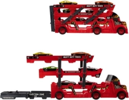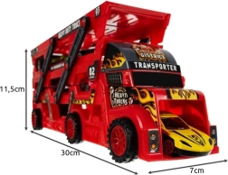 A szállító minőségi műanyagból készült, a kisautók fém és műanyag kombinációjából. Az intuitív, kézi kilövő elemek nélkül is villámrajtot tesz lehetővé. A kamion kompakt méretei (30 × 12 × 7 cm), illetve a kisautók méretei (7 × 2 × 3 cm) ideálissá teszik a gyerekszobába és utazáshoz is.