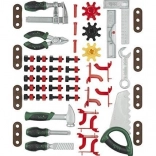 Fűrész, kalapács, villáskulcsok, harapófogó, reszelők, csavarok és kötőelemek – minden, amire a gyermeknek szüksége lehet építéshez és csavarozáshoz.