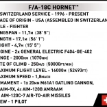 Ez a modell nagyszerű ajándék a repülés és katonai műszaki rajongók minden korosztályának. A licencelt dizájnnal tökéletesen illik egy tinédzser szobájába, valamint egy reprezentatív irodába. Az F/A-18C Hornet leváltja a francia Mirage IIIS-t a svájci légierőben 1992 óta, amikor 34 repülőgép rendelésére került sor különböző verziókban.