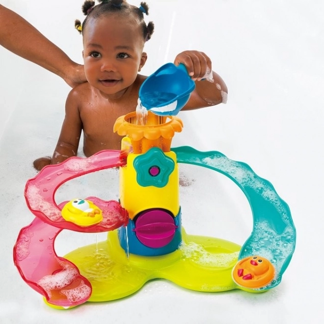 Változtassa a hétköznapi fürdést kalanddá a színes műanyag akvaparkunkkal! Ez a játék két spirálos vízicsúszdát kínál, központi toronyhoz kapcsolódva kék virággombbal és tetején egy polippal, ami támogatja a szenzációs és képzeletbeli játékot. A gyerekek órákon át élvezhetik a fürdőjátékot, amely támogatja a mozgást és a színstimulációt. Tartalmaz két állatkát pontonokon és egy bálna formájú merítőkanalat a vízöntéshez.