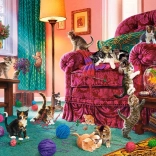 A puzzle egy otthonos nappalit ábrázol, tele játékos kiscicákkal és színes fonalgombolyagokkal.