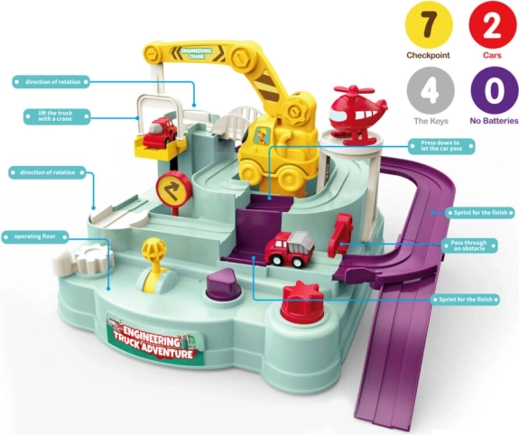 - Két kisautó a csomagban: versenyezzetek, ki lesz a gyorsabb, és legyetek a pálya bajnokai.
