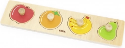 Ez a minőségi fa bedugós kirakó gyümölcsmotívumokkal (alma, narancs, banán, körte) a kisgyermekek kezeihez lett tervezve. Minden darab fa fogantyúval rendelkezik a könnyű kezelhetőségért, ami támogatja a finommotorika és az önállóság fejlődését.