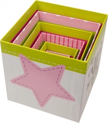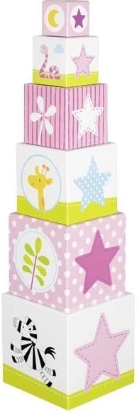 A készlet 6 darab erős kartonkockát tartalmaz, amelyekből magas torony építhető, vagy egymásba helyezhetők. Minden kockát barátságos állat-, növény- és számillusztrációk díszítenek, így a gyerekek játékosan fejlesztik alapvető készségeiket és a türelmet.