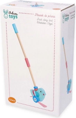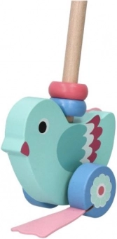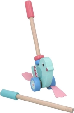 Ez a gyönyörű fa toló kacsa úgy lett kialakítva, hogy segítse a 12 hónapos kortól a gyermekek mozgási és egyensúlyi képességek fejlesztését. Az eltávolítható rúd, melynek hossza 48 cm, lehetővé teszi a játék könnyű tolását és kezelését. A teljes design egyesíti a türkiz testet és rózsaszín szárnyakat, ami ösztönzi a gyermekek képzeletét és színérzékét.