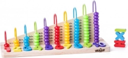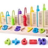 A készlet tartalmaz egy fa számolót és 13 kivehető színes blokkot számok és szimbólumok +, - és = formájában.