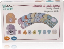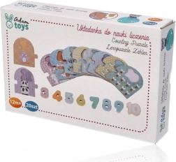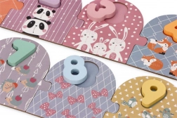 Ez a minőségi fa kirakó ötvözi a szórakozást és a tanulást. Az 1–10-ig minden számhoz tartozik egy kis tábla a megfelelő számú aranyos állatkával, így a gyermek könnyen megérti a kapcsolatot a számjegy és a mennyiség között. A domború, színes számjegyek kényelmesen illeszkednek a kis kezekbe, és támogatják a finommotorika és a vizuális észlelés fejlődését.
