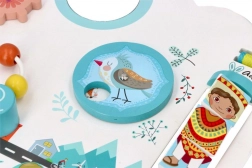 Két fogaskerék, csúsztatható gyöngyök és kisautók, valamint forgatható figurák segítik a fogás, a koordináció és a logikus gondolkodás gyakorlását.