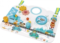 Az interaktív elemek, mint a fogaskerekek, a csúsztatható gyöngyök és kisautók, a biztonságos, törésmentes tükör, illetve a forgó kerék rejtett állatokkal fejlesztik a finommotorikát, a koncentrációt és az ok-okozati gondolkodást. A állítható pántoknak köszönhetően a tábla otthon és útközben is praktikus – a gyermek elé állítható vagy a kiságyra akasztható.