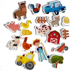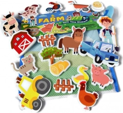 Aranyos állatok, traktor és pajta a végtelen mesékhez fürdés közben. A darabok könnyűek, puhák és kíméletesek a kis kezekhez.