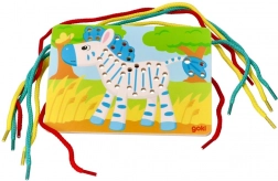 Fejlesszétek gyermeked finommotorikáját és koncentrációját a Goki márkájú, papagáj, oroszlán és zebra alakú fa befűzős játékokkal. Ezek a játékok fából készültek, ami biztosítja tartósságukat és a könnyű kezelhetőséget gyerekek számára. A csomag három képet és színes zsinórokat tartalmaz kreatív szórakozáshoz.