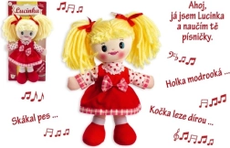 Lucinka egy aranyos, 30 cm-es rongybaba, első ölelgetéshez és játékhoz ideális. A pocak megnyomására azt mondja: „Szia, Lucinka vagyok, és megtanítalak dalokra”, majd népszerű cseh dalokat énekel, amelyeket a gyerekek ismernek és szeretnek.