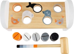 A színes peckek beütögetése a fa kalapáccsal erősíti a fogást, a pontosságot és a kéz–szem koordinációt – kulcskészségek a korai fejlődésben.