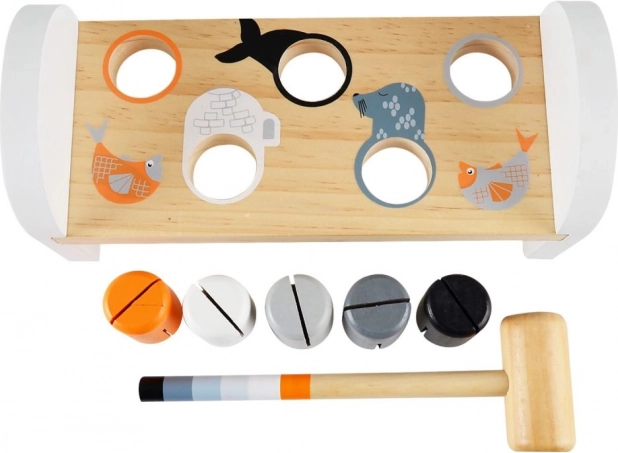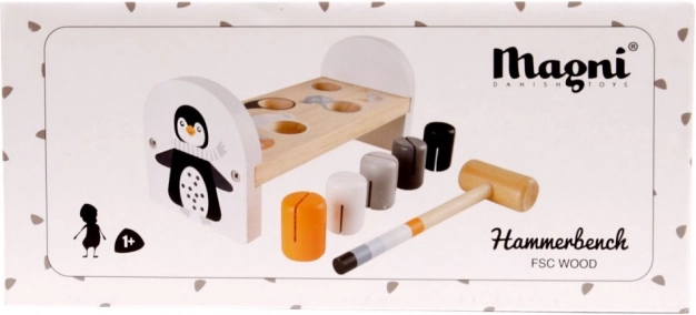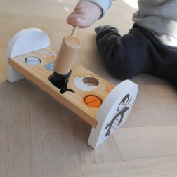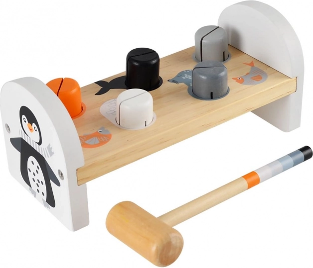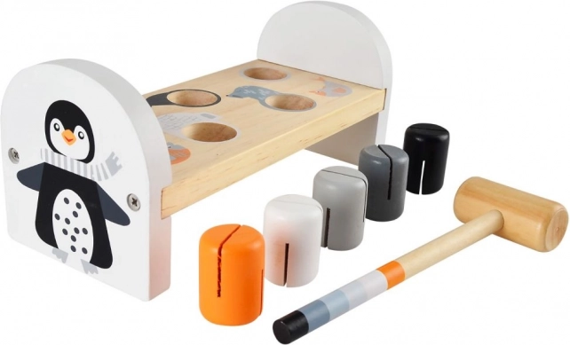 Ez a masszív, fából készült kalapálós pad aranyos pingvin motívummal rengeteg szórakozást és tanulást kínál. A gyerekek a kalapács segítségével fokozatosan beütögetik a színes peckeket, így természetes módon fejlesztik a motoros készségeket, a türelmet és a logikus gondolkodást. A kompakt méret ideális a kis kezekhez, otthoni és utazós játékhoz egyaránt.
