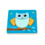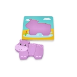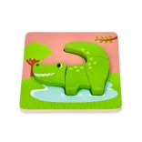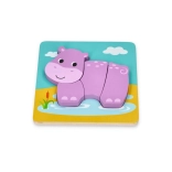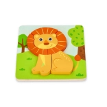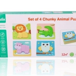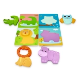 A gyerekek sorban kirakhatják a krokodilt, a vízilovat, a baglyot és az oroszlánt – minden motívum külön fa lapon, ami támogatja a koncentrációt és az örömteli sikerélményt.
