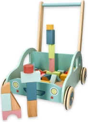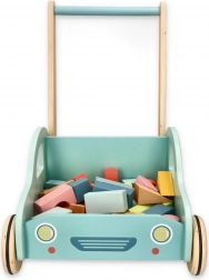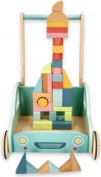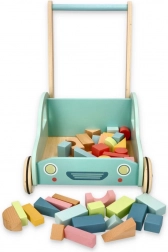 A színes fa kockák fejlesztik a finommotorikát, a képzeletet és a logikus gondolkodást. A kocsi praktikus tárolóként szolgál a kockáknak és a kész építményeknek is.