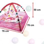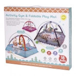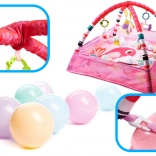 A szőnyeg erős és tartós, hosszú távú használatra tervezték. A függesztett játékok és a pasztell színű labdák hozzájárulnak az érzékek fejlődéséhez.