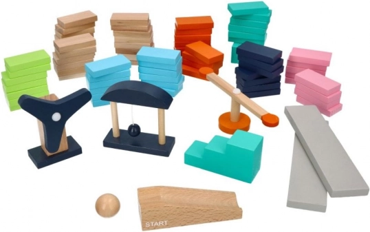 - 120 fa kocka 6 színben, 3 mechanikus elem (pl. körhinta, szélforgó, golyós kapu), 2 hídtábla, 3 fokú lépcső, indító csúszda golyóval