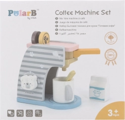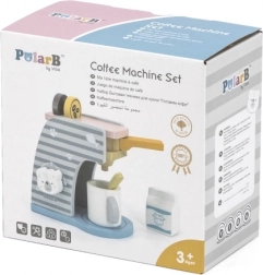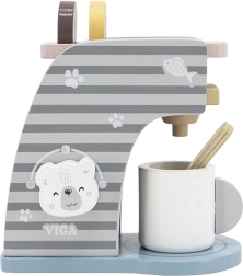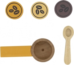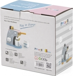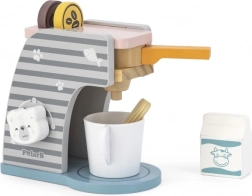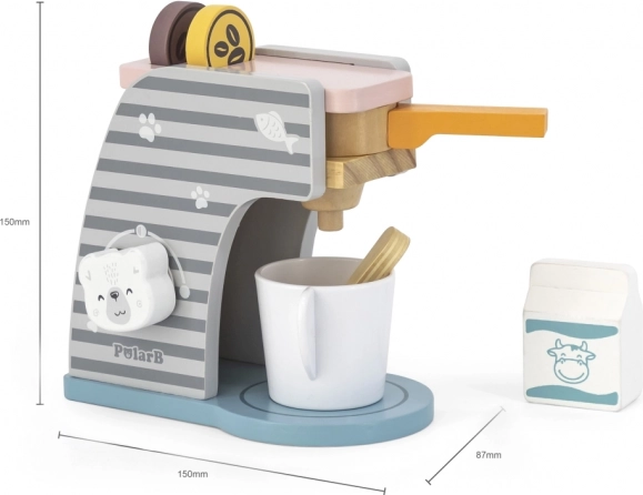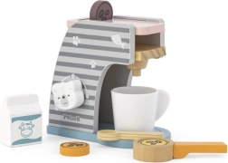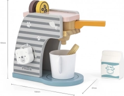 Ez a finom színekkel és bájos motívumokkal díszített, fából készült gyerek kávéfőző a kis baristáknak készült. A forgó elemek és a karos rendszer egy valódi kávéfőzőt utánoznak, így a gyerekek „elkészíthetik” az espressót, hozzáadhatják a „tejet”, és megkeverhetik a fehér csészében a kanállal.