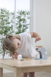 A készlet támogatja a szórakoztató társas játékot, fejleszti a szem–kéz koordinációt, és megtanítja az alapvető asztali szokásokat. A sima, biztonságos élek és a masszív fa szerkezet ideális a mindennapi játékhoz a gyerekszobában vagy az óvodában.