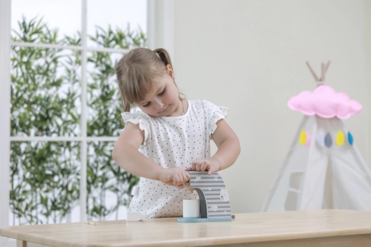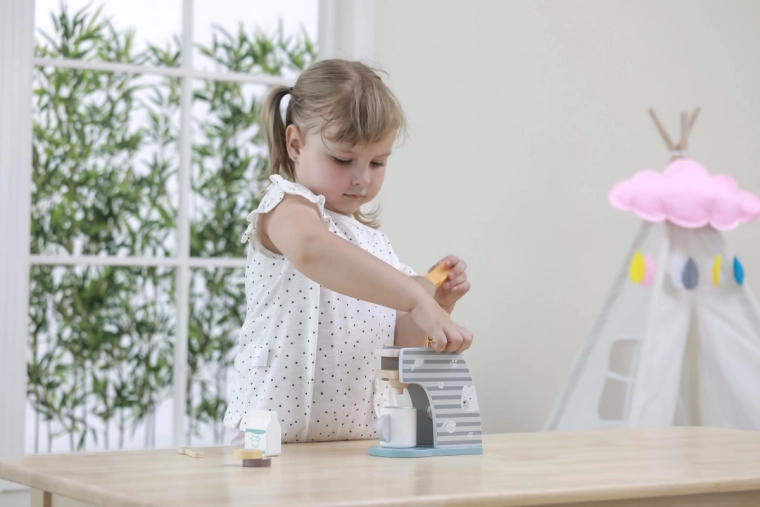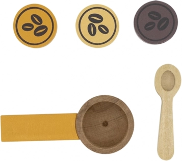 Stílusos, fából készült gyerek kávéfőző 3 éves kortól, amely a realista kávékészítést hozza el minden gyerekkonyhába. A forgó szabályzó, a karos tartó és a mellékelt kiegészítők (csésze, kanál, kapszulák és „tej”) fejlesztik a finommotorikát, a képzelőerőt és a szerepjátékot. A kompakt méretek és a minőségi, lakkozott fa biztonságos és tartós játékot biztosítanak minden nap.