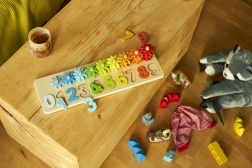 A talapzatba mart számok és a színben összehangolt kerekek támogatják a számjegyek felismerését, a válogatást és az első lépéseket a számolásban.