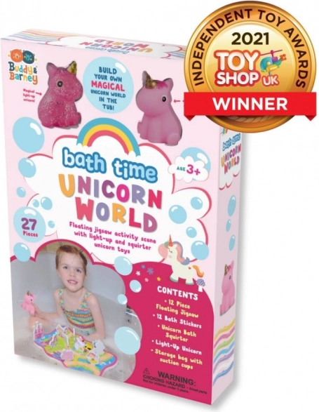 Színes, habból készült elemek, amelyek a vízen lebegnek és benedvesítés után a kád falán is megtapadnak. A gyerekek saját egyszarvú-birodalmat rakhatnak össze, és közben formákat és színeket tanulhatnak.