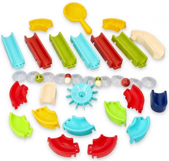 A tapadókorongoknak köszönhetően az elemek stabilan tartanak a csempén vagy a kádban, és az akár 173 cm-es teljes pályahossz bőséges teret ad a fantáziának. A készlet 3 éves kortól ajánlott, fejleszti a szem-kéz koordinációt, a türelmet és a térbeli képzelőerőt.