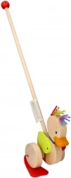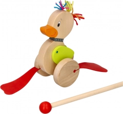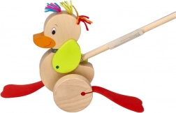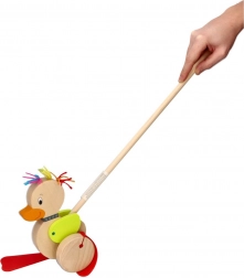 Fából készült kacsa alakú játék kerekekkel, hosszú rúddal a mozgatáshoz, segít fejleszteni a gyermek motorikus képességeit. Színes taréja és piros uszonya biztosítják a szórakoztató játékot.