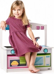 Forgatható gombok, csappal ellátott mosogató és a háztartási gépeket idéző grafika támogatják a képzeletet, és megtanítják a gyerekeket a konyhai tevékenységek alapjaira.