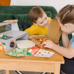 Tartalmaz fa pizzát, különféle feltéteket és játékpénzt, ami lehetővé teszi a gyerekek számára, hogy átéljék a pizza elkészítésének és eladásának teljes folyamatát.