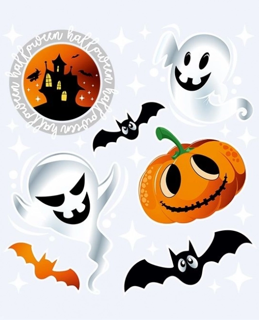 - Stílusos halloweeni motívumok – szellemek, tökök, denevérek és kísértetház.
