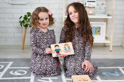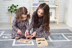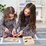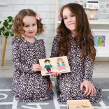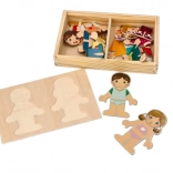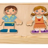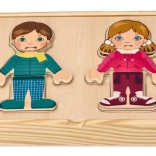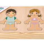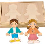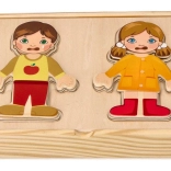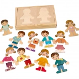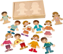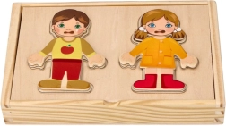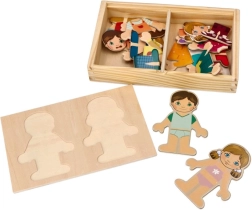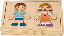 Ez a fa, mágneses kirakó fiú és lány figurákkal tucatnyi lehetőséget kínál az öltöztetésre és az egyes elemek kombinálására. Játék közben a gyerekek gyakorolják a kéz–szem koordinációt, a logikus gondolkodást, valamint a formák és színek érzékelését.