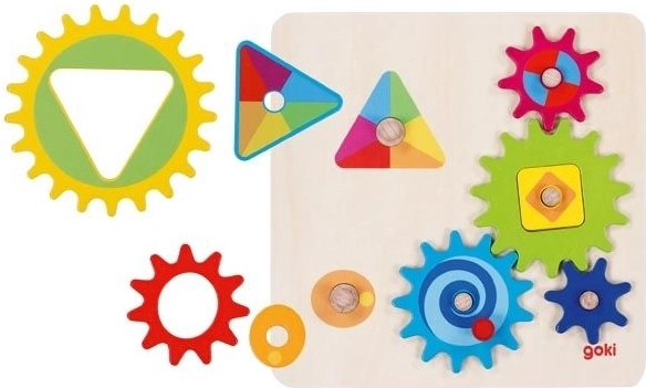 A GOKI márka fa logikai játéka fejleszti a gyermeki képzeletet és türelmet. A gyerekek színes fogaskerekeket helyeznek a táblára, és kipróbálják, hogy a kék kerék elhelyezése után mindegyik kerék megfelelően forog-e – és melyik irányba. A kreatív, játékos tanulás segít megérteni a mechanika alapjait, az ok-okozati összefüggéseket.
