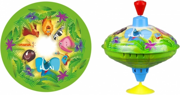 A dzsungel motívumos pörgettyűt vidám állatképek és kellemes „zümmögő” hang forgás közben teszi különlegessé. Ideális első játékokhoz, segít megérteni az ok-okozati összefüggéseket és támogatja a koncentrációt. Az alsó tapadókorong jobb stabilitást és biztonságosabb játékot biztosít különböző felületeken.