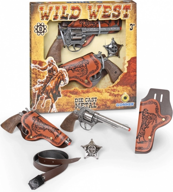 Fedezze fel a Vadnyugat autentikus szórakozását a GONHER készlettel – két fém cowboy revolver 8-lövetű tárhoz, kiegészítve egy stílusos tokkal és seriffjelvénnyel. Ideális tematikus játékokhoz, jelmezekhez és kis kalandoroknak.