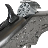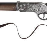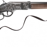 Ez a stílusos karos ismétlő puska fém testet kombinál „fa” hatású tussal, és gazdag dekoratív gravírozást kapott. A masszív fém szerkezetnek köszönhetően ideális a gyakori játékhoz, és remekül illik a gyerekek western kalandjaihoz. A narancssárga csővég egyértelműen jelzi, hogy játékról van szó.
