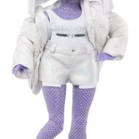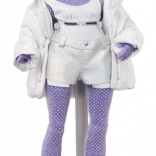 A baba modern lila megjelenéssel és kiegészítőkkel van díszítve, amelyek kiemelik egyedi stílusát.