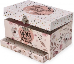 Az alsó részen kihúzható fiók kínál extra helyet, a biztonságos fém záródás és a tartós, könnyű anyagból készült kialakítás pedig ideálissá teszi a gyerekszobába. A „Girls rule the world” és „Dreams come true” feliratok játékos megjelenést adnak, és ösztönzik a kreatív fantáziát.