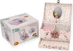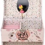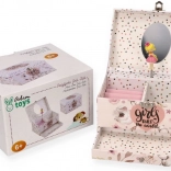 A bájos, zenélő ékszerdoboz forgó balerinával minden kis hercegnőt elvarázsol. Van benne áttekinthető rekeszelés, gyűrűtartó párnácskák, kihúzható fiók és ovális tükör. Ideális ékszerek és apróságok tárolására, és egyben szép szobadekoráció.